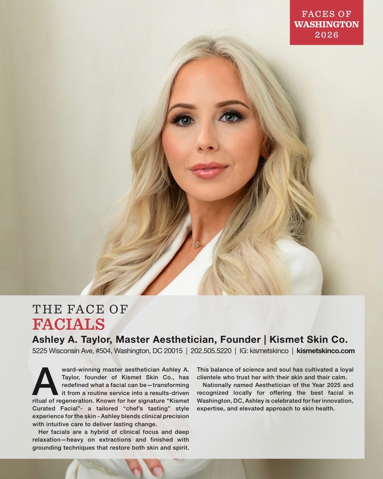 Ashley was named the 'Face Of Facials' in the Washingtonian's yearly 'Faces Of Washington' series.